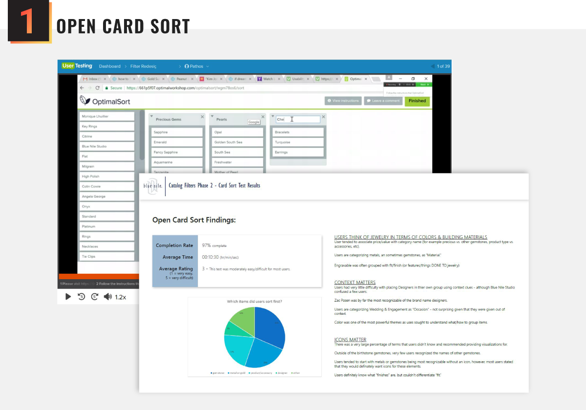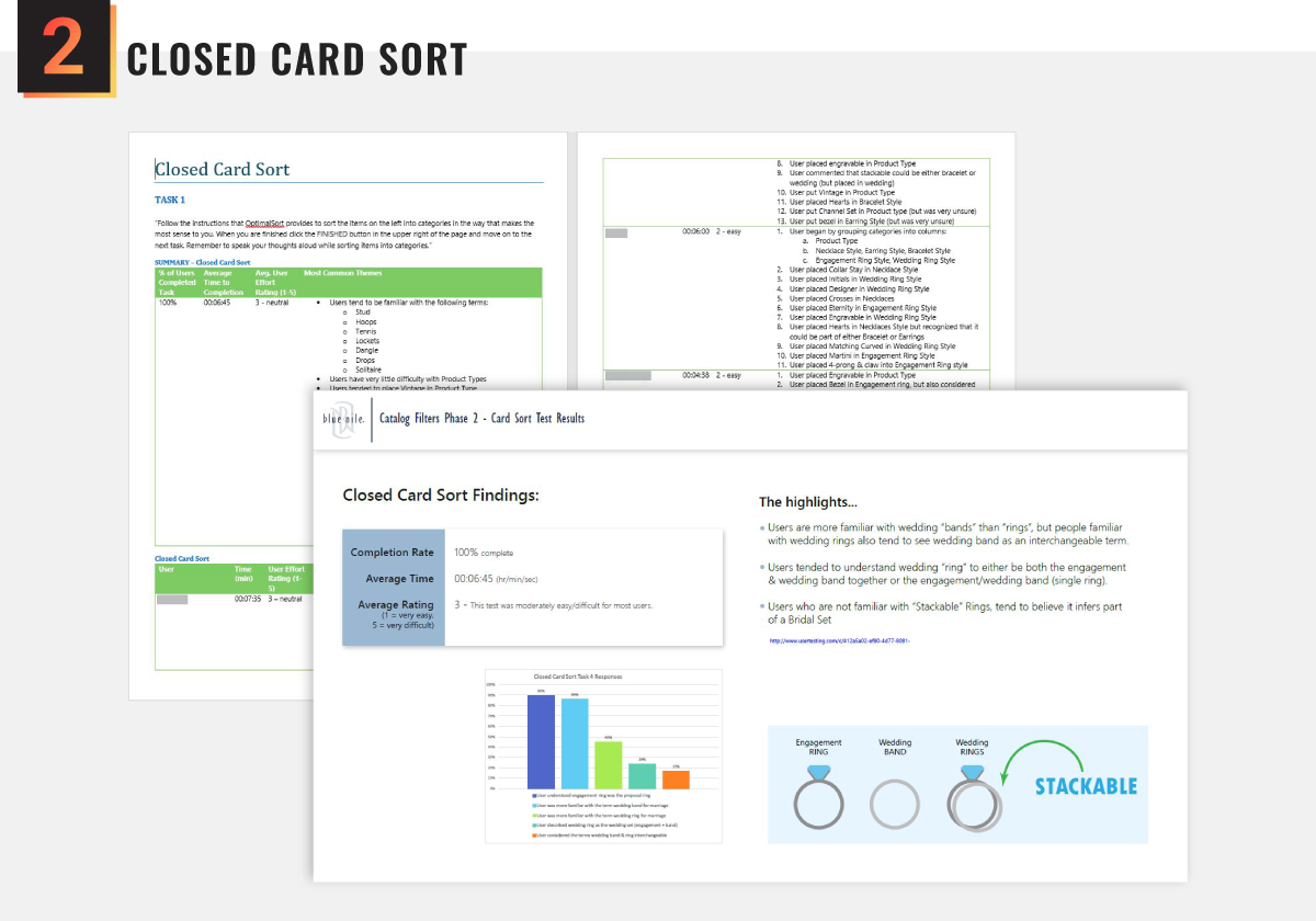 Next we perfomed Closed Card Sort Testing to help us understand how users fit content into a pre-existing structure, as well as revealing how users defined concepts with similar meanings, such as "ring" vs. "band."