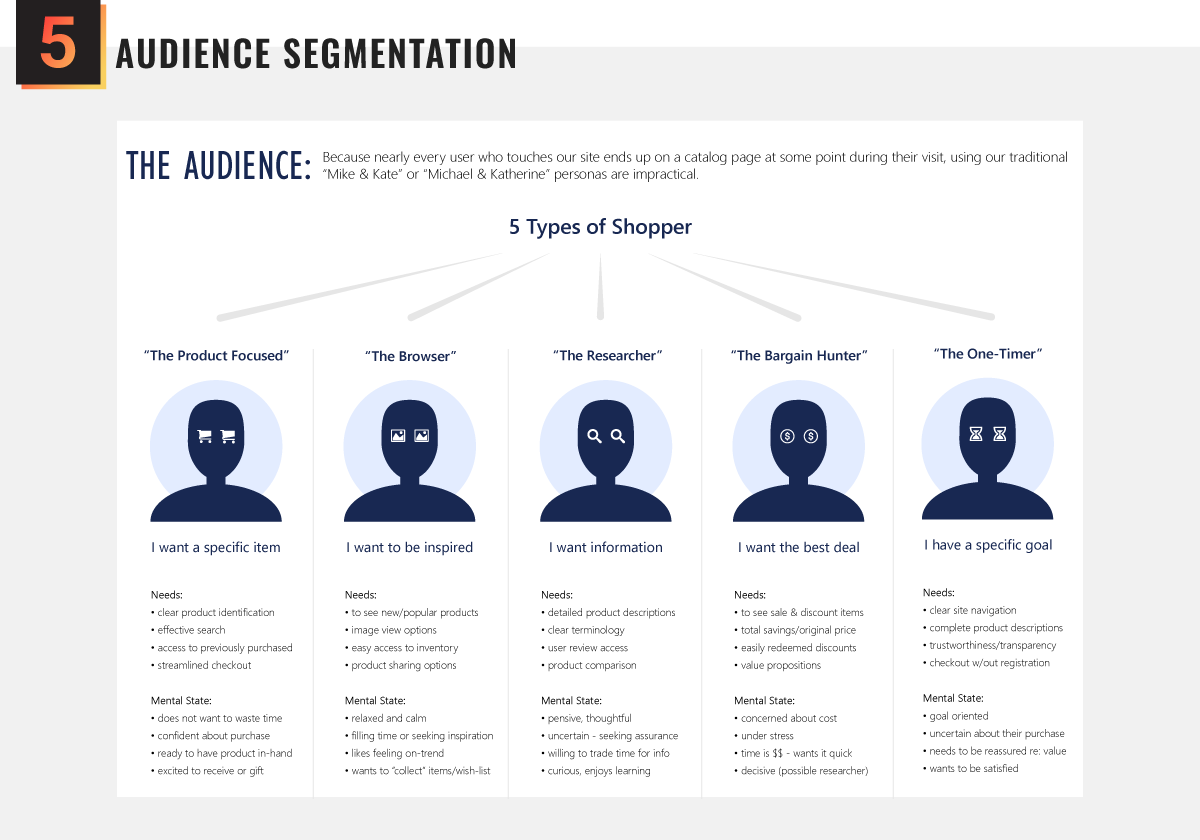 Catalog pages are interacted with by nearly every customer, which meant our traditional user personas were insufficient. So instead, we segmented our audience into 5 types of shoppers to better predict their behavior and needs.