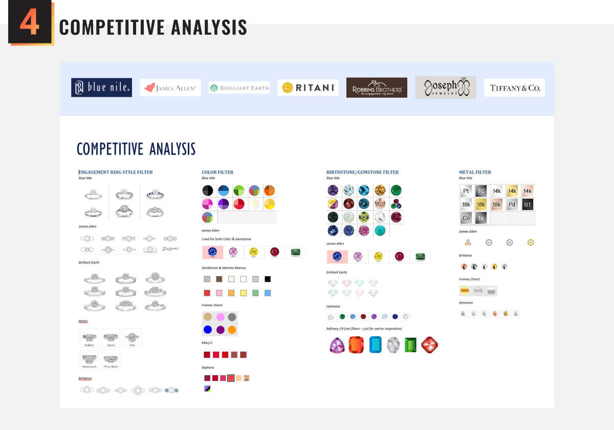I performed a competitive analysis to understand how competitors were filtering their products. I also researched other e-commerce companies to find inspiration from designs that were meeting user's needs in innovative and delightful ways.